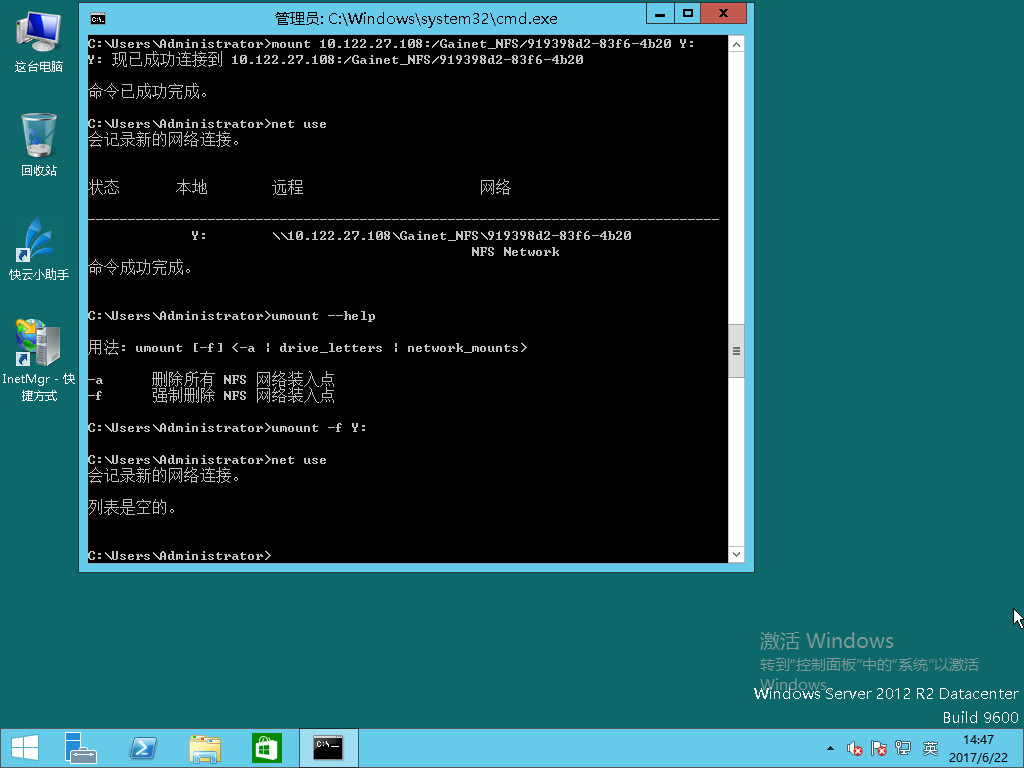 命令:mount 10.122.27.108:/Gainet_NFS/919398d2-83f6-4b20 Y: