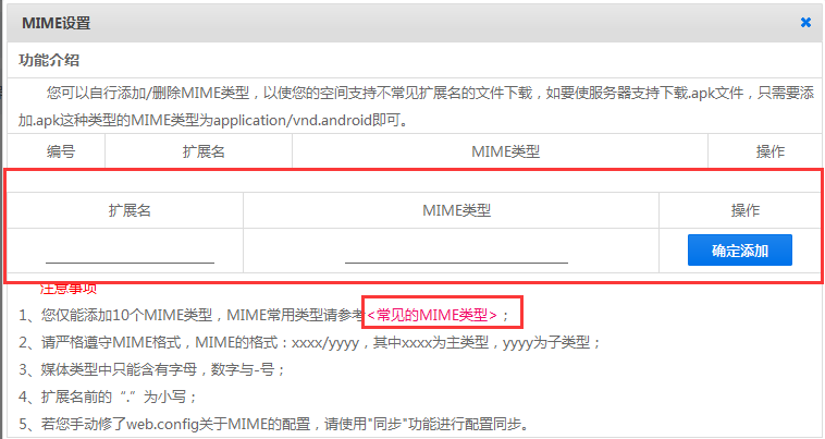 windows主機(jī)管理頁(yè)面點(diǎn)擊“MIME設(shè)置”可自行添加/刪除MIME類型,以使您的空間支持不常見(jiàn)擴(kuò)展名的文件下載,如圖: