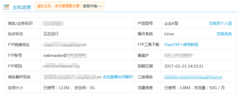 主機(jī)信息:主機(jī)信息內(nèi)可查看主機(jī)的基本信息包括FTP賬號(hào)密碼,空間容量、流量大小、解析地址、三級(jí)域名等信息