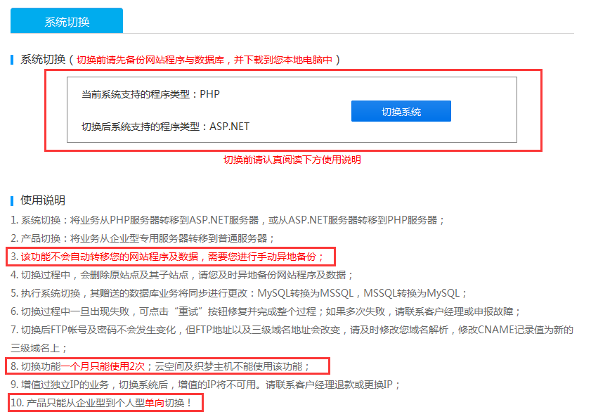 為了方便用戶選擇錯(cuò)誤系統(tǒng)退款麻煩,可將業(yè)務(wù)從PHP服務(wù)器轉(zhuǎn)移到ASP.NET服務(wù)器,或從ASP.NET服務(wù)器轉(zhuǎn)移到PHP服務(wù)器,但需備份好網(wǎng)站數(shù)據(jù),系統(tǒng)切換后相當(dāng)于新系統(tǒng),不保留之前的網(wǎng)站數(shù)據(jù)且一月只能試用2次;如圖: