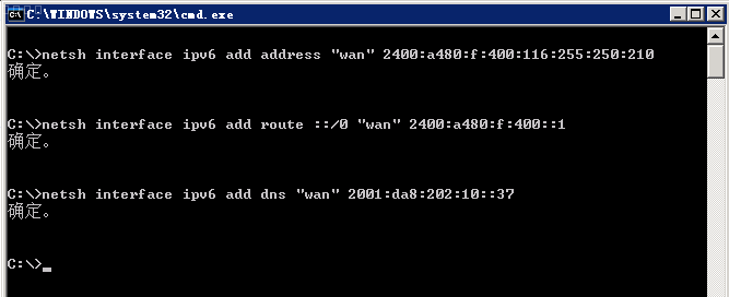 netsh interface ipv6 add address "wan" 2400:a480:f:400:116:255:250:210
