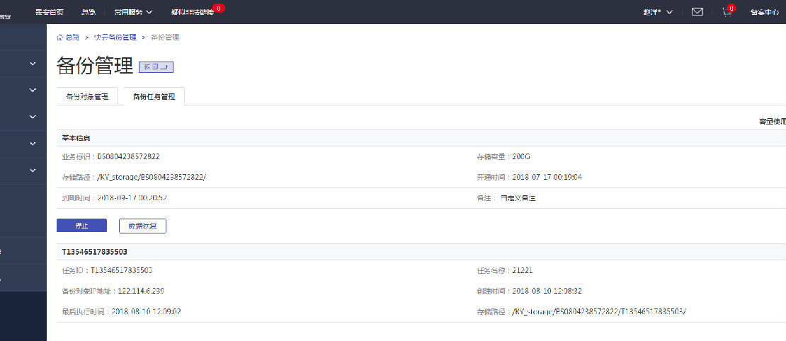 備份任務(wù)管理界面展示備份任務(wù)的基本信息:任務(wù)ID,任務(wù)名稱,備份對象IP,以及備份任務(wù)的云備份路徑等;還可以看到任務(wù)管理操作按鈕。