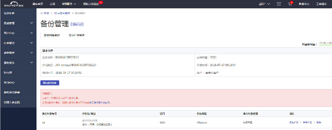 5、在備份對象列表中,點(diǎn)擊“刪除”,如果該備份對象列表中沒有備份任務(wù),刪除該備份對象記錄,否者提示“刪除失敗,當(dāng)前存在備份任務(wù)”。