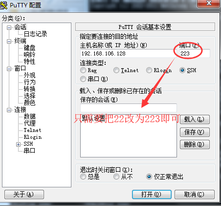 打開文件之后按下i鍵,向下翻找到port 22字樣把前面的#去掉之后把22修改為223然后按esc再按wq退出即可,最后重啟ssh服務(wù),重啟命令service sshd restart