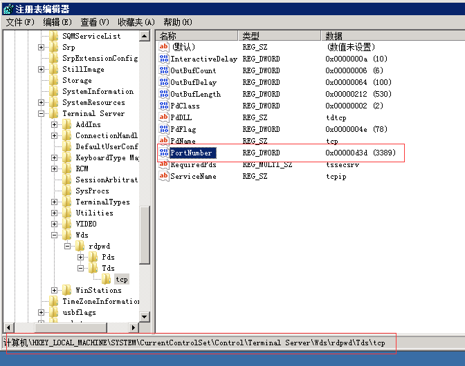 修改注冊表HKEY_LOCAL_MACHINE\SYSTEM\CurrentControlSet\Control\Terminal Server\Wds\rdpwd\Tds\tcp 下的 "PortNumber",