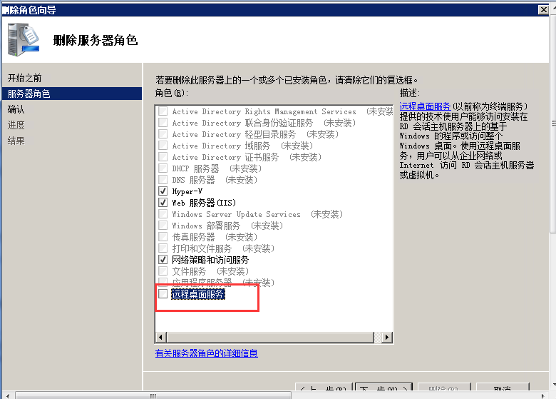 把遠(yuǎn)程桌面服務(wù)前面的√去掉,點(diǎn)擊下一步