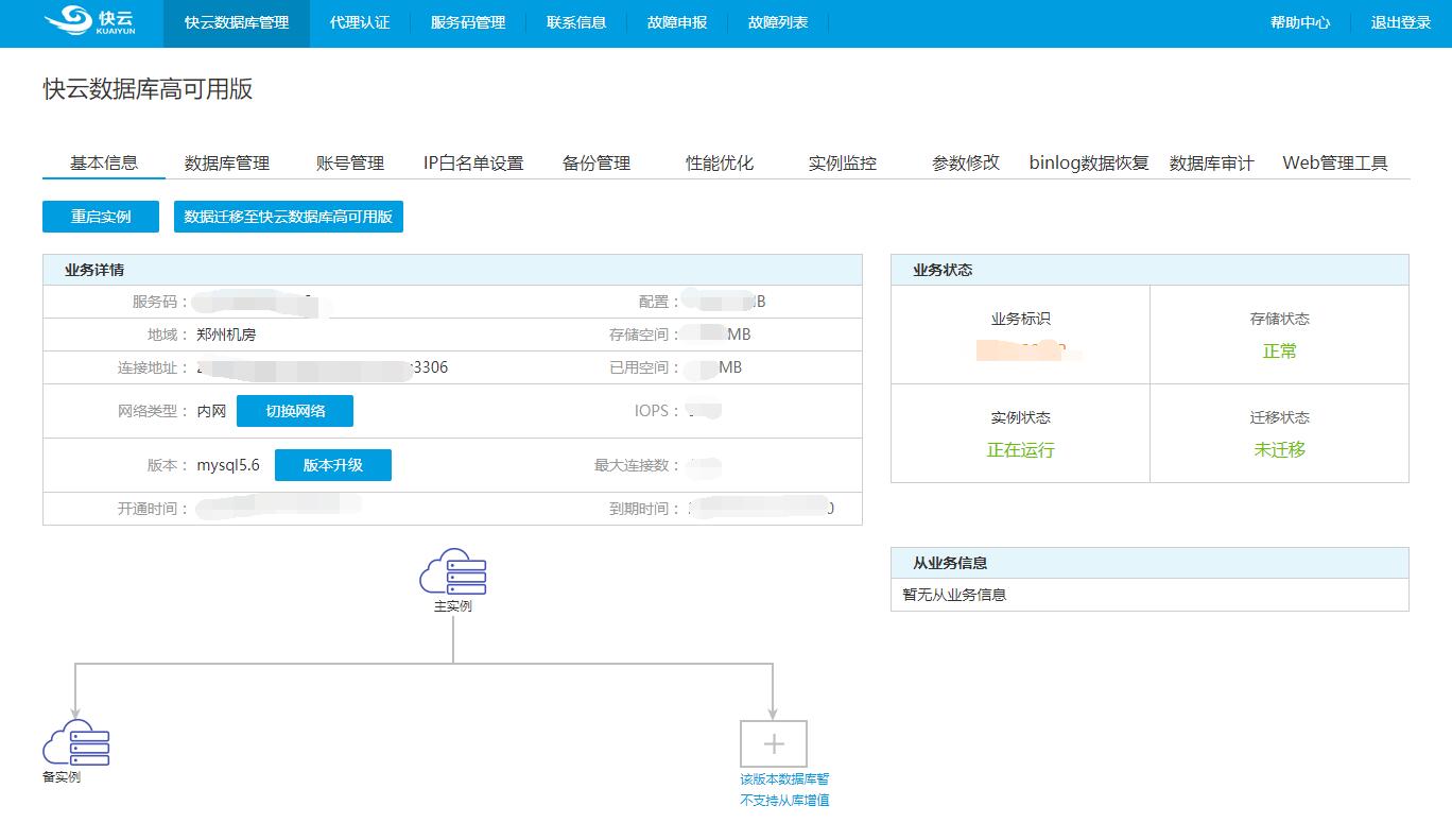 展示數據庫實例的基本配置信息和實例狀態(tài),提供一鍵重啟,一鍵遷移,升級版本,切換網絡和添加只讀實例等功能。