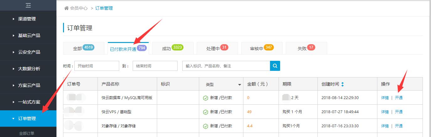 1、購買快云數據庫后,在訂單列表中會有一個未開通的訂單,點擊“開通”按鈕