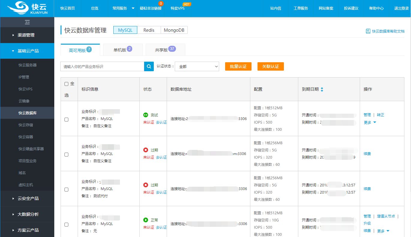 包含業(yè)務標識、業(yè)務狀態(tài)、連接地址、配置信息和到期時間,并提供管理、續(xù)費、升級等功能。