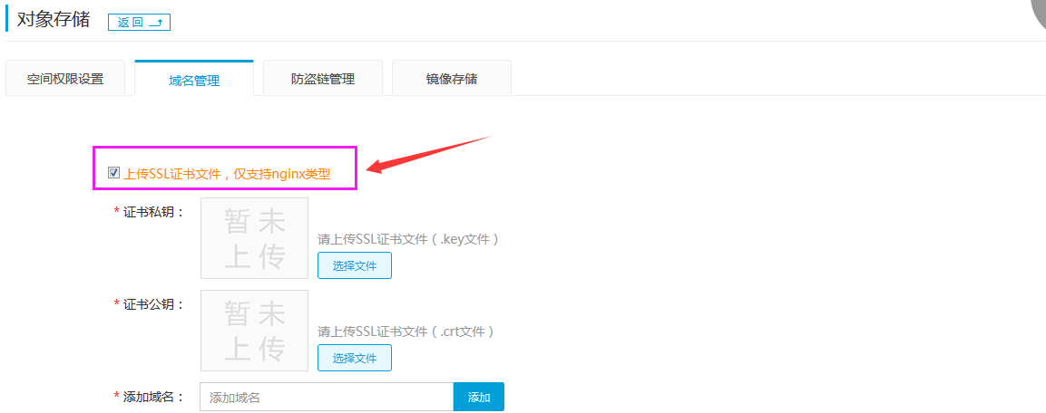 1. 勾選上傳SSL證書文件,僅支持nginx類型選項 ;