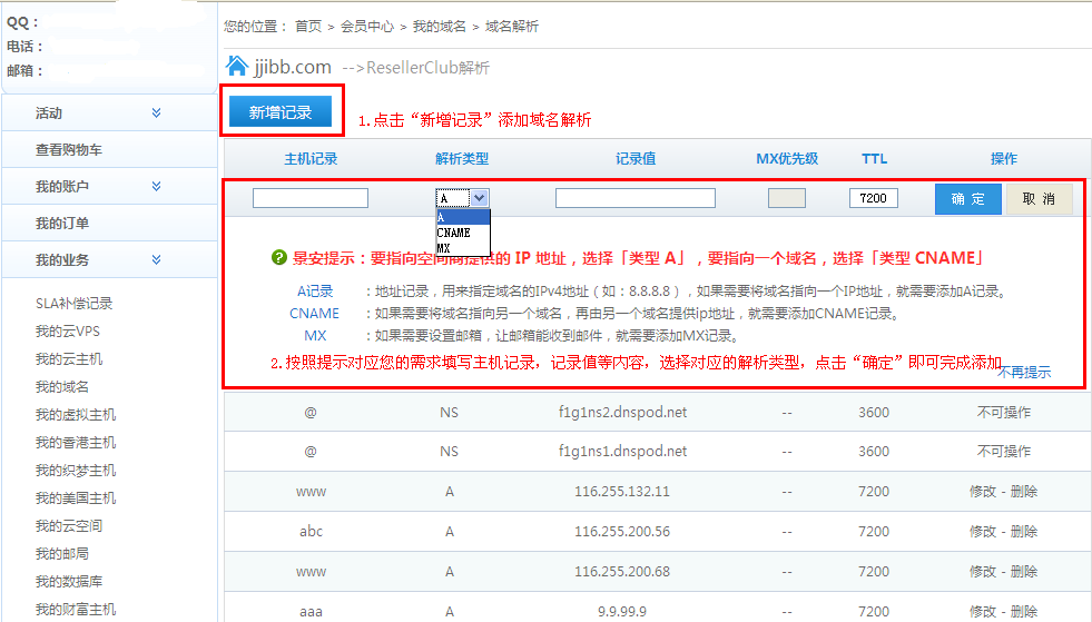 3.進入解析頁面,點擊“新增記錄”,選擇您需要添加的解析類型,填寫解析內(nèi)容即可。