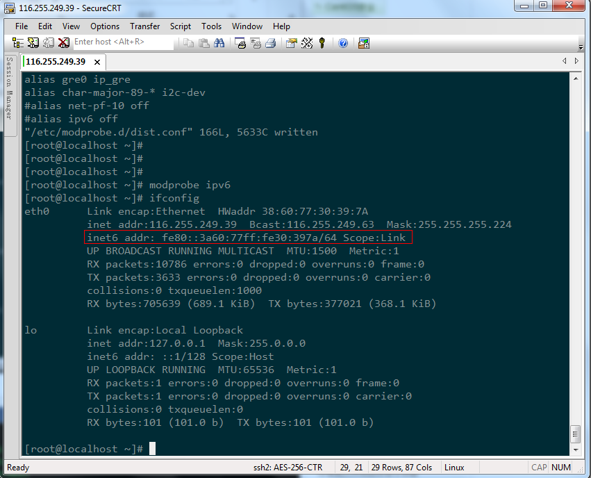 b)添加IPv6模塊輸入命令:modprobe ipv6(不用重啟)效果如圖: