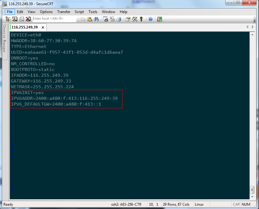 IPV6ADDR=2400:a480:f:413:116:255:249:39----填寫服務(wù)器IPv6地址。