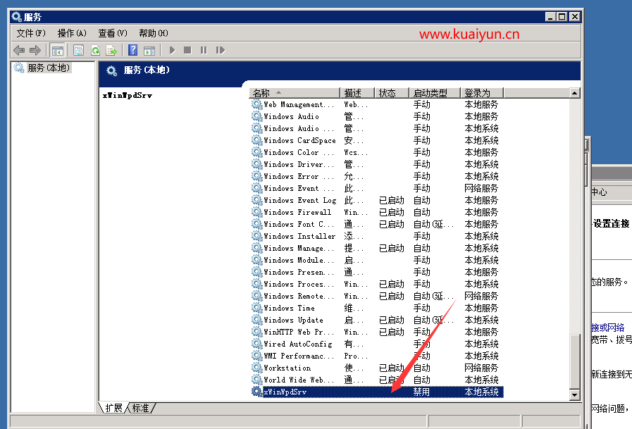 禁用服務方法:”開始”->”運行”->輸入services.msc->右鍵打開xWinWpdSrv服務屬性,將啟動類型修改為禁用,如圖