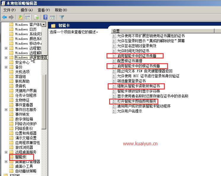 3>”開始”->”運行”->輸入gpedit.msc依次打開->”計算機配置->”管理模塊windows組”->”智能卡”,關閉遠程智能卡(此操作避免rdp服務被攻擊利用),如圖