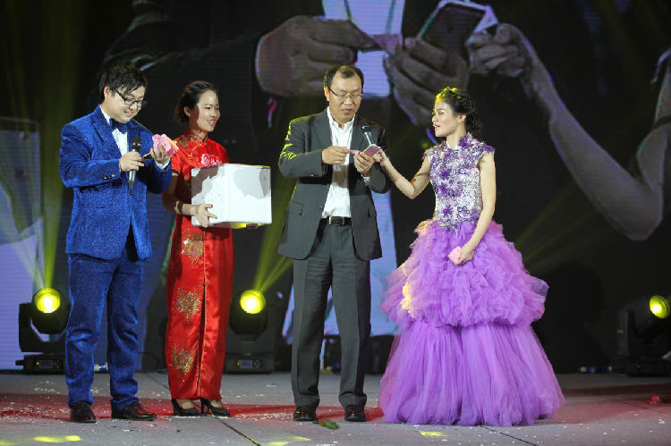 公司領(lǐng)導(dǎo)們正在發(fā)紅包,紅包雨下不停,線上線下沸騰不止,屢次將晚會(huì)推向高潮。