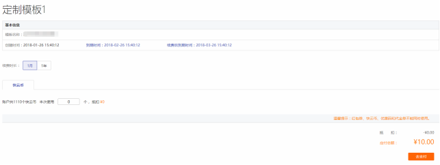 1.點擊模板列表頁的“續(xù)費”按鈕,進入續(xù)費頁面,如下圖: