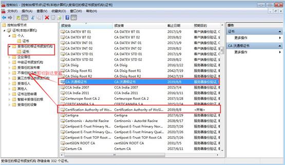 二、進(jìn)入到MMC計(jì)算機(jī)用戶中后,在受信任的根證書頒發(fā)機(jī)構(gòu)里面找到如圖所示的證書,郵件剪切到“不信任的證書”(只有一個(gè)就剪切一個(gè))