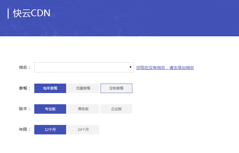 如果域名已經(jīng)在免費CDN中添加過,可以直接在域名列表中選擇,如果沒有,可以點擊添加域名鏈接進行添加,解析完成后再進行購買操作。