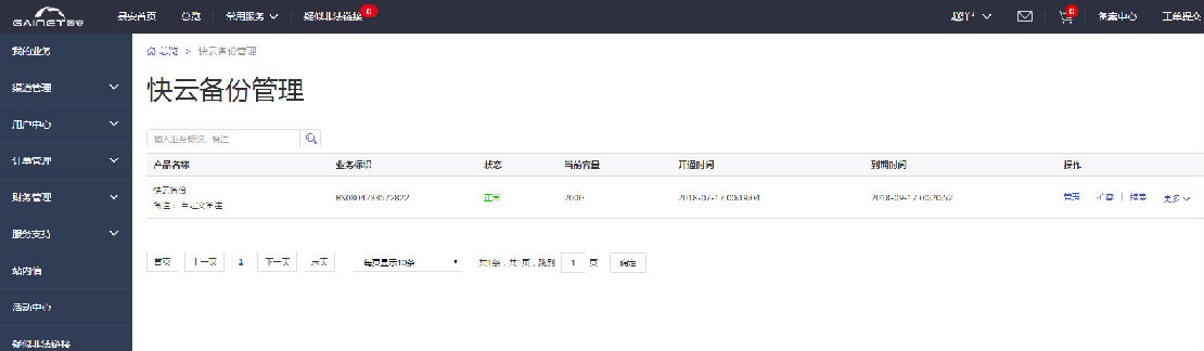 1. 進(jìn)入快云備份管理平臺業(yè)務(wù)列表頁面,可以看到快云備份的業(yè)務(wù)列表信息:業(yè)務(wù)基本信息包含業(yè)務(wù)名稱、業(yè)務(wù)標(biāo)識、狀態(tài)、容量、開通時間、到期時間等;業(yè)務(wù)操作管理包含管理、增值、續(xù)費(fèi)等。