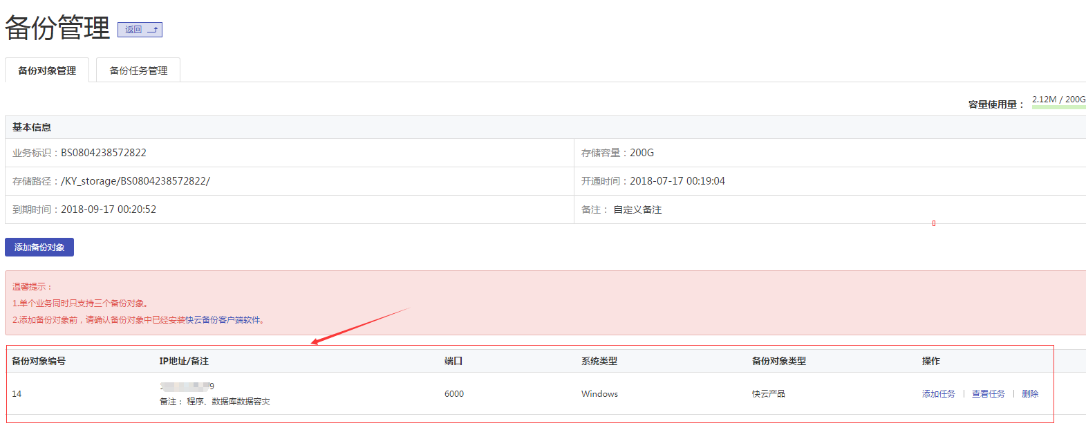 5、在備份對象列表中,點(diǎn)擊“刪除”,如果該備份對象列表中沒有備份任務(wù),刪除該備份對象記錄,否者提示“刪除失敗,當(dāng)前存在備份任務(wù)”。