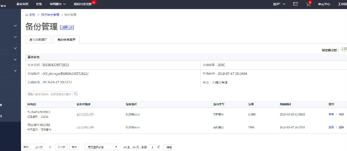 備份任務(wù)管理界面展示備份任務(wù)的基本信息:任務(wù)ID,任務(wù)名稱,備份對象IP,以及備份任務(wù)的云備份路徑等;還可以看到任務(wù)管理操作按鈕。