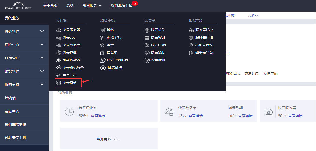 登錄成功后,在會員中心左側(cè)導(dǎo)航欄點(diǎn)【我的業(yè)務(wù)員】,在【云計(jì)算】下找到快云備份,如圖P2.1所示: