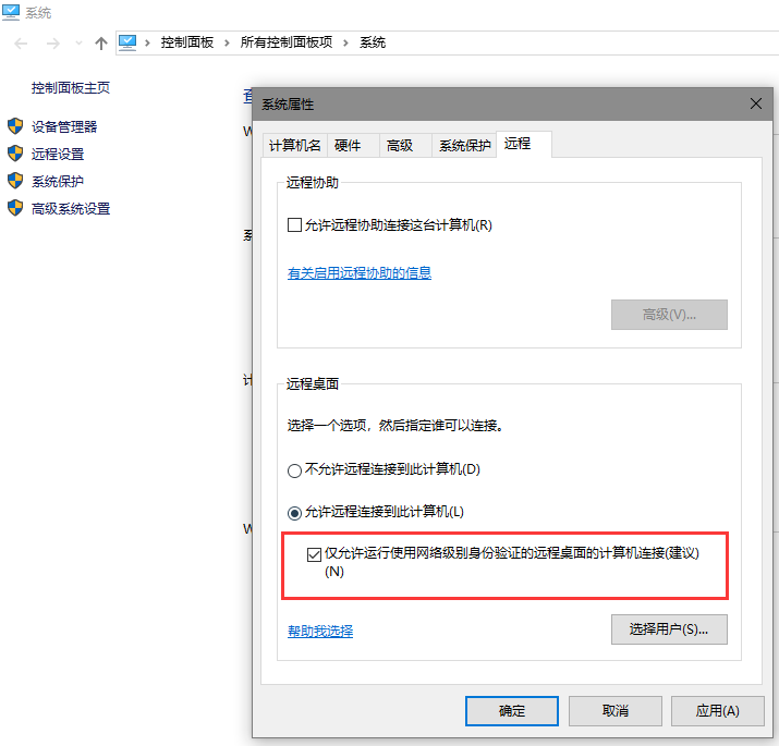 遠(yuǎn)程桌面設(shè)置中勾選了:僅允許運(yùn)行使用網(wǎng)絡(luò)級(jí)別身份驗(yàn)證的遠(yuǎn)程桌面的計(jì)算機(jī)連接,去掉勾選即可,問(wèn)題得到解決。Windows 2008系統(tǒng)勾選“允許運(yùn)行任意版本遠(yuǎn)程桌面的計(jì)算機(jī)連接(較不安全)”選項(xiàng)。