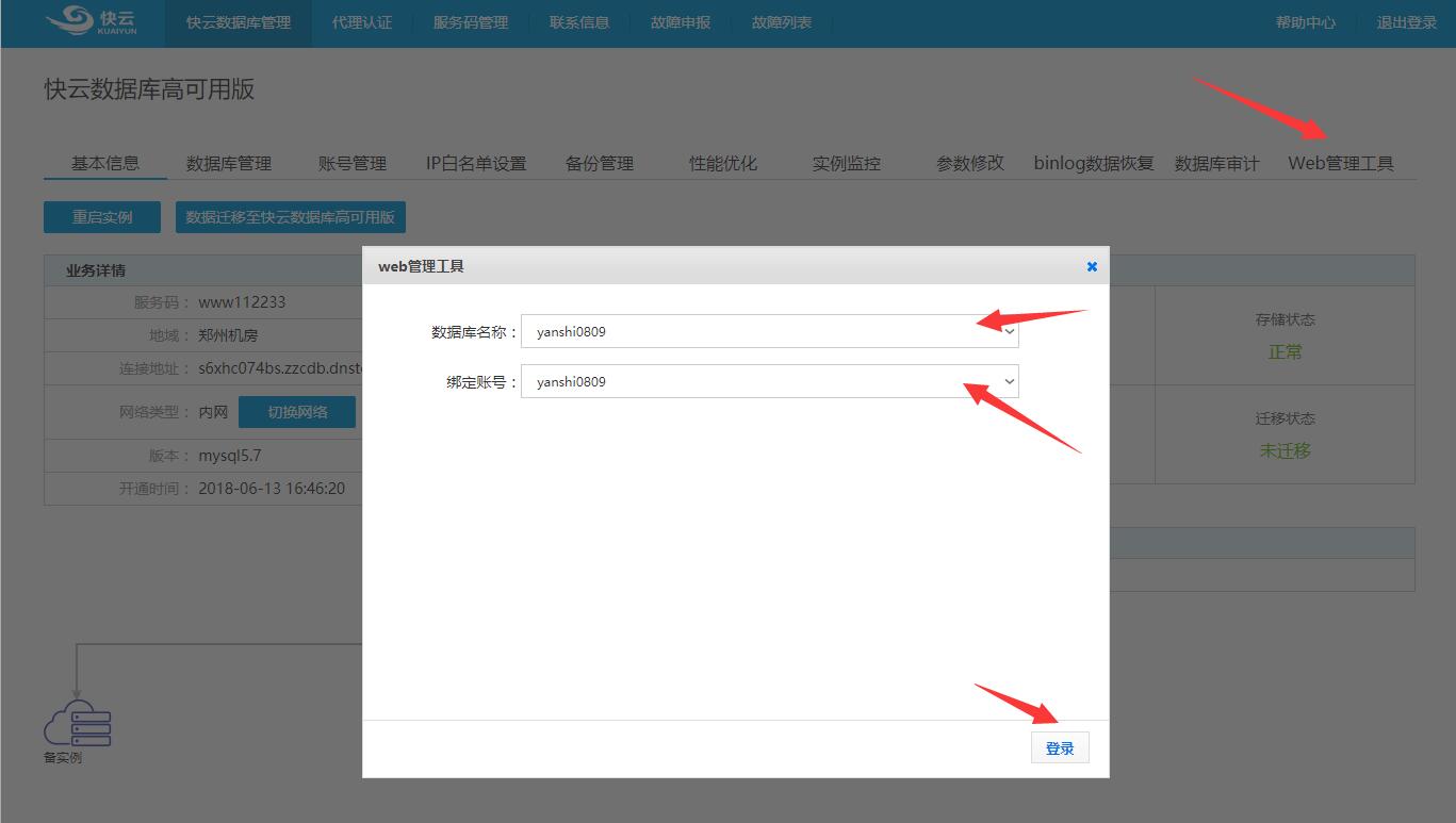1)、在管理管理頁面,點擊“web管理工具”,在彈出的窗口中選擇數據庫名和綁定的數據庫用戶,點擊“登錄”按鈕