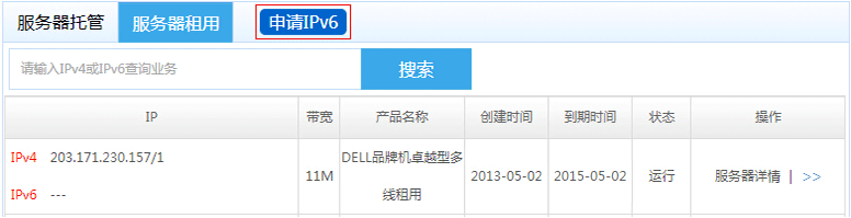 2、打開需要申請IPv6地址的服務器業(yè)務(服務器托管/服務器租用/機柜)