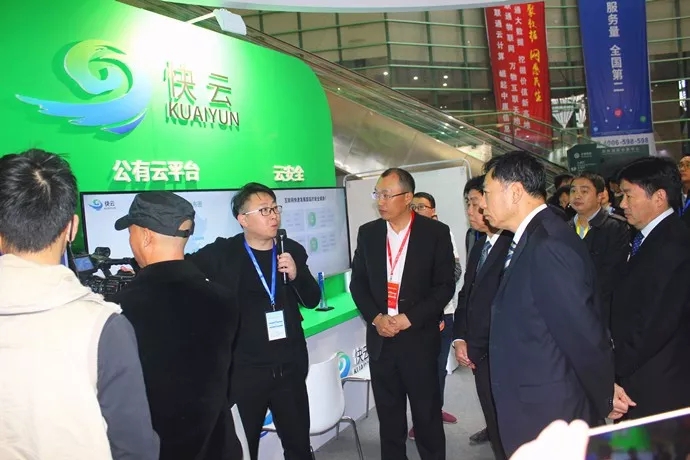 在景安網(wǎng)絡(luò)董事長楊小龍(左二)的陪同下,河南省副省長張維寧(左四),國家工信部黨組成員、總工程師張峰(左三)等領(lǐng)導(dǎo)、專家一行到景安網(wǎng)絡(luò)旗下快云云計算公司展覽區(qū)參觀指導(dǎo)。