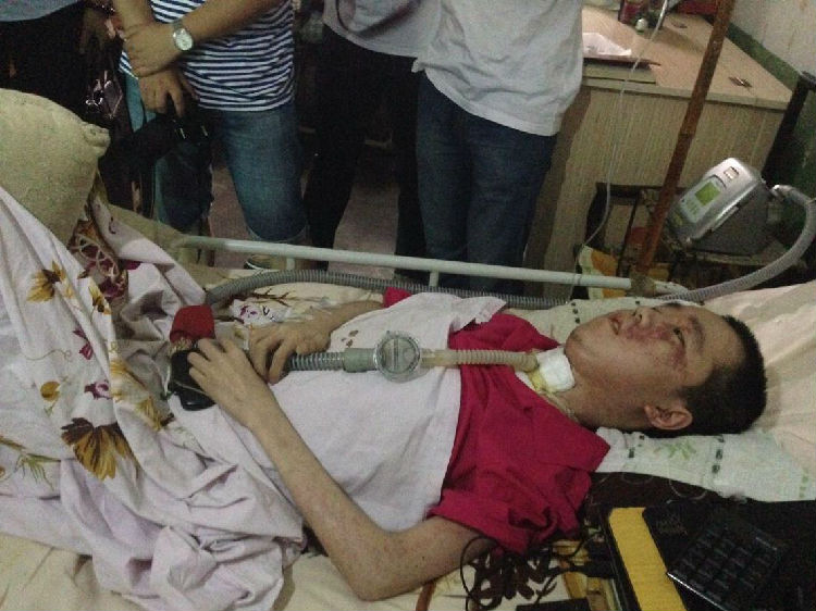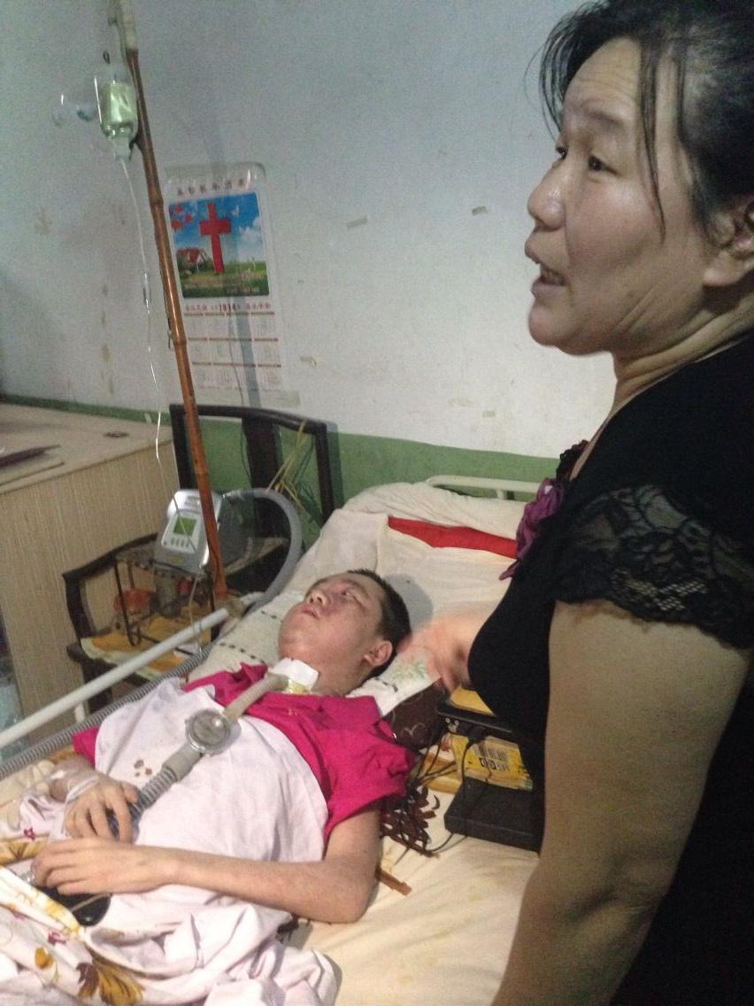 原志亮躺了13年的屋子光線昏暗,只有一個燈泡發(fā)出微弱的光。一條連接著呼吸機的塑料管道直插進原志亮的脖子上,房間里響著呼吸機發(fā)出的單調(diào)聲音。